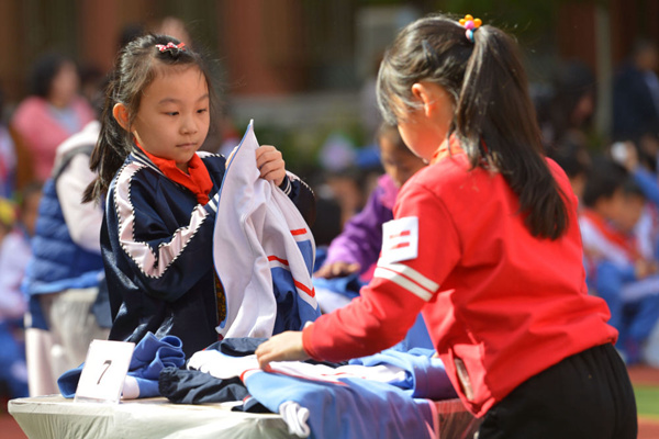 小學(xué)學(xué)生在進(jìn)行疊衣服比賽 劉東岳 攝