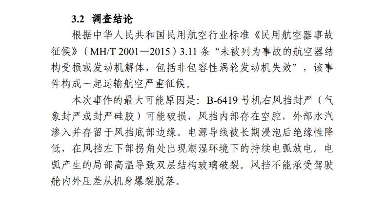 調查報告顯示,本次事件的最大可能原因是:B-6419號機右風擋封嚴(氣象封嚴或封嚴硅膠)可能破損,風擋內部存在空腔,外部水汽滲入并存留于風擋底部邊緣。電源導線被長期浸泡后絕緣性降低,在風擋左下部拐角處出現潮濕環境下的持續電弧放電。電弧產生的局部高溫導致雙層結構玻璃破裂。風擋不能承受駕駛艙內外壓差從機身爆裂脫落。