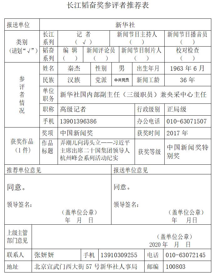 經新華社編務會議投票表決并經新華社黨組會議審議,確定秦杰同志為新華社推薦的第十六屆長江韜奮獎候選人。