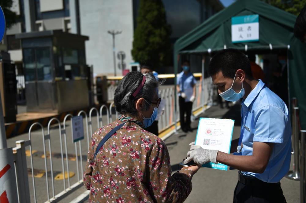 5月12日,在國家圖書館入口處,工作人員引導讀者掃描健康碼。新華社發(陳鐘昊 攝)
