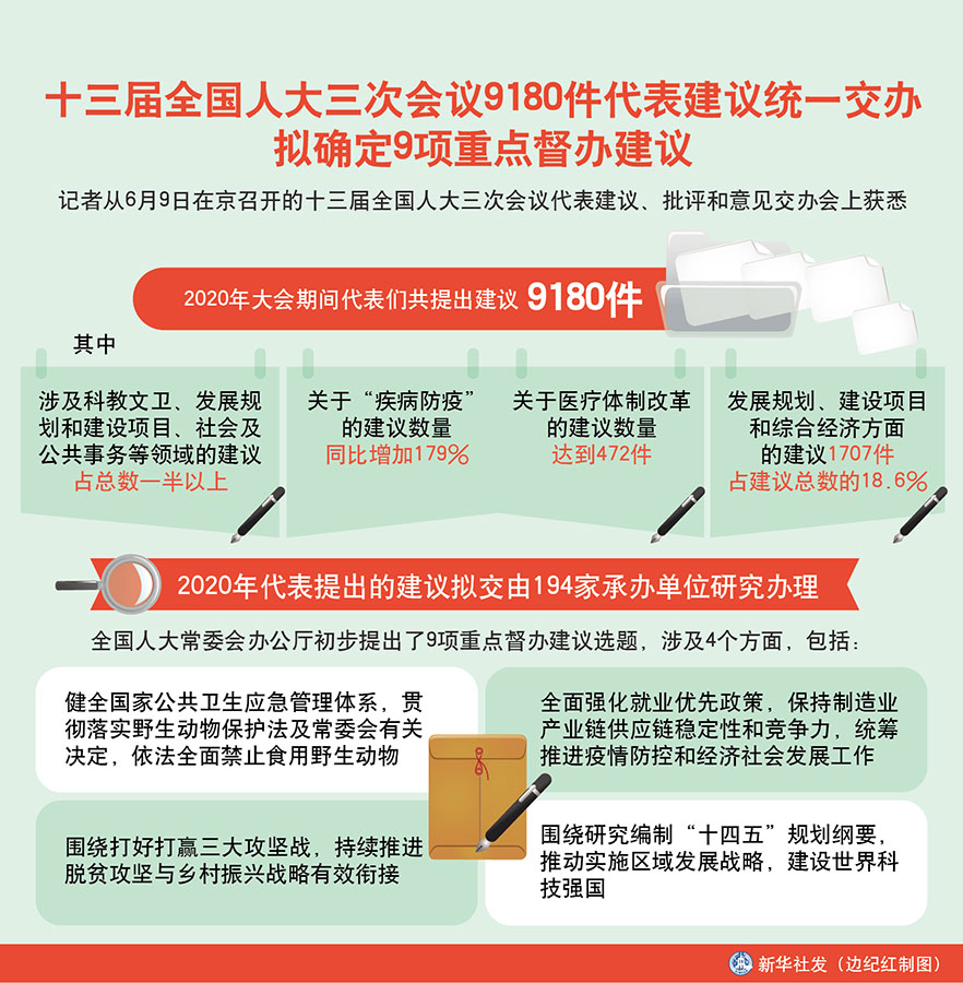 按照代表法有關規定,今年代表提出的建議擬交由194家承辦單位研究辦理。全國人大常委會辦公廳初步提出了9項重點督辦建議選題,涉及4個方面,包括:健全國家公共衛生應急管理體系,貫徹落實野生動物保護法及常委會有關決定,依法全面禁止食用野生動物;全面強化就業優先政策,保持制造業產業鏈供應鏈穩定性和競爭力,統籌推進疫情防控和經濟社會發展工作;圍繞打好打贏三大攻堅戰,持續推進脫貧攻堅與鄉村振興戰略有效銜接;圍繞研究編制“十四五”規劃綱要,推動實施區域發展戰略,建設世界科技強國。