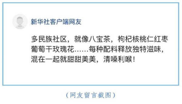 還有網友以寧夏著名的八寶茶來形容各民族團結和諧的景象——各種配料搭在一起,才能有滋有味。缺哪一樣,都少點“茶味”。