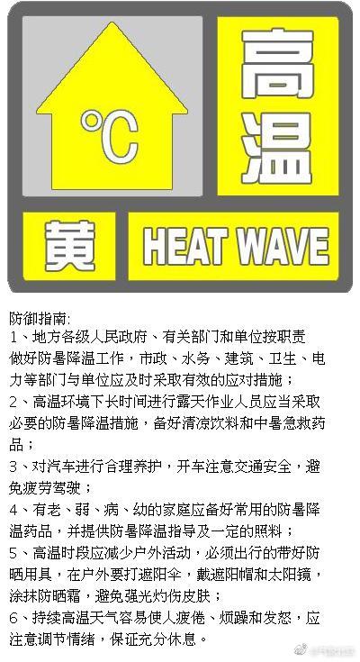 據北京市氣象局官方微博消息,北京市氣象臺2020年6月14日6時50分發布高溫黃色預警信號:預計6月14日至16日,本市大部分地區日最高氣溫將達35℃以上,請注意防范。未來三天天氣以晴為主,紫外線很強,體感炎熱,外出需注意防暑防曬,心腦血管疾病和高血壓患者應減少高溫時段戶外活動時間。 ????