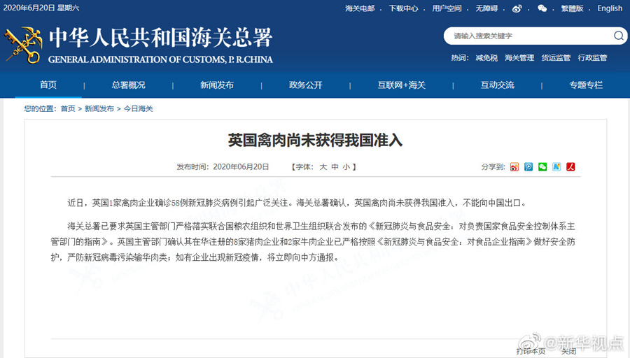 海關(guān)總署20日發(fā)布公告說(shuō),近日英國(guó)一家禽肉企業(yè)確診58例新冠肺炎病例引起廣泛關(guān)注。海關(guān)總署確認(rèn),英國(guó)禽肉尚未獲得我國(guó)準(zhǔn)入,不能向中國(guó)出口。海關(guān)總署已要求英國(guó)主管部門(mén)嚴(yán)格落實(shí)聯(lián)合國(guó)糧農(nóng)組織和世界衛(wèi)生組織聯(lián)合發(fā)布的《新冠肺炎與食品安全:對(duì)負(fù)責(zé)國(guó)家食品安全控制體系主管部門(mén)的指南》。英國(guó)主管部門(mén)確認(rèn)其在華注冊(cè)的8家豬肉企業(yè)和2家牛肉企業(yè)已嚴(yán)格按照《新冠肺炎與食品安全:對(duì)食品企業(yè)指南》做好安全防護(hù),嚴(yán)防新冠病毒污染輸華肉類(lèi);如有企業(yè)出現(xiàn)新冠疫情,將立即向中方通報(bào)。(記者劉紅霞)