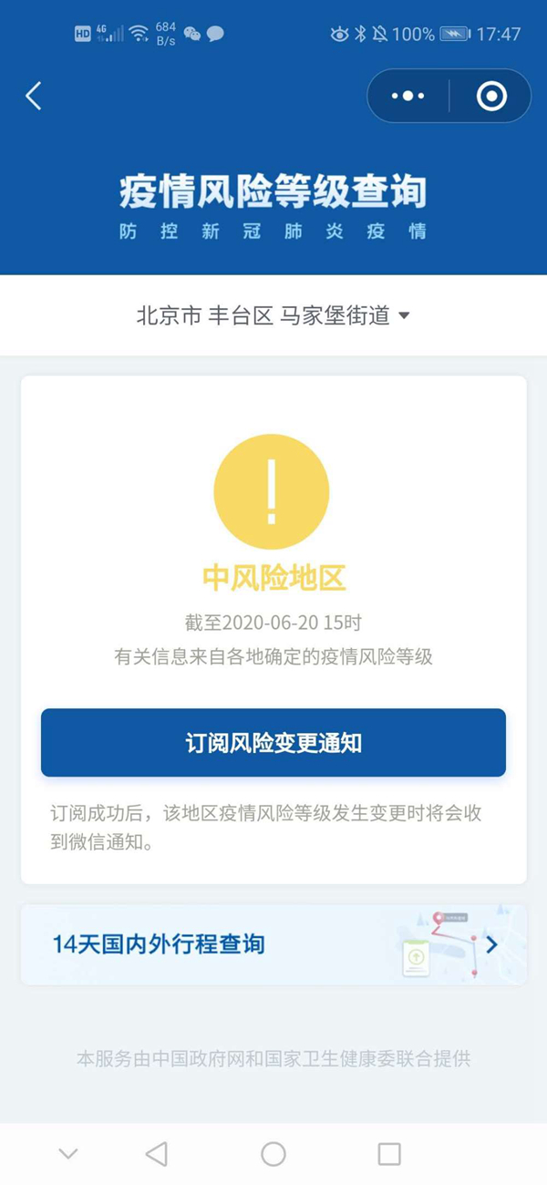 記者從國務院客戶端小程序“疫情風險等級查詢”上了解到,截至6月20日15時,北京豐臺馬家堡街道升級為中風險地區。