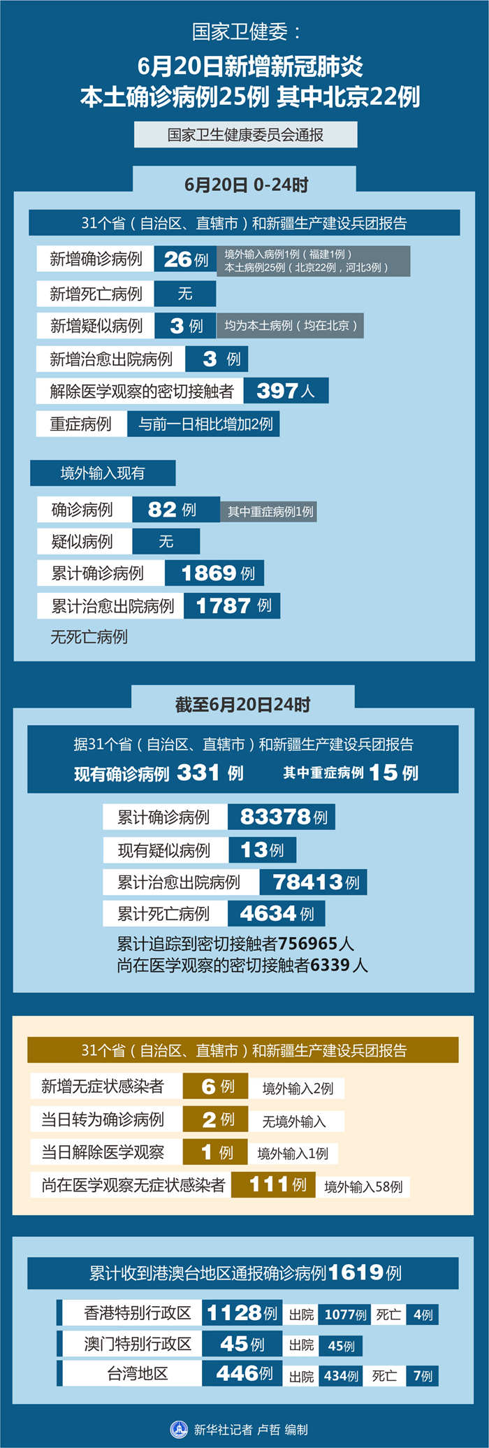 截至6月20日24時,據31個?。ㄗ灾螀^、直轄市)和新疆生產建設兵團報告,現有確診病例331例(其中重癥病例15例),累計治愈出院病例78413例,累計死亡病例4634例,累計報告確診病例83378例,現有疑似病例13例。累計追蹤到密切接觸者756965人,尚在醫學觀察的密切接觸者6339人。