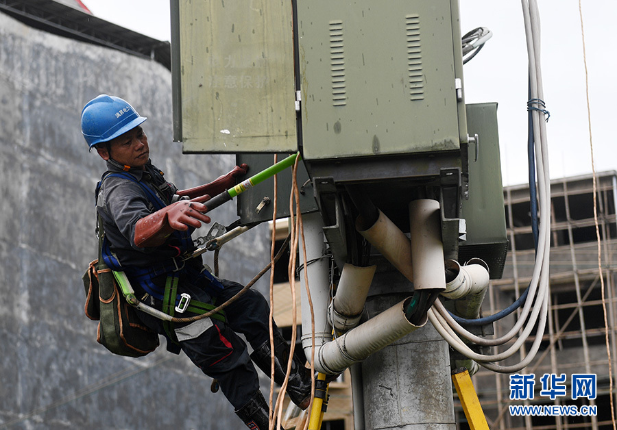 6月9日,在廣西桂林市永??h堡里鎮,供電部門工作人員在搶修損壞的供電設備。? 新華社記者 陸波岸 攝(資料圖)