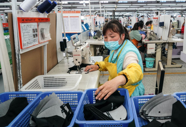 淮安源通制帽有限公司扶貧車間內,工人在生產帽子 楊磊 攝
