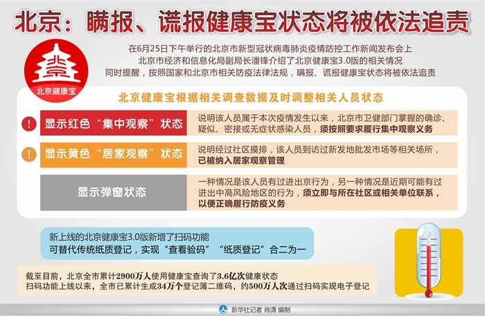 新華社北京6月25日電(記者魯暢)在25日下午舉行的北京市新型冠狀病毒肺炎疫情防控工作新聞發(fā)布會上,北京市經(jīng)濟和信息化局副局長潘鋒介紹了北京健康寶3.0版的相關(guān)情況,同時提醒,按照國家和北京市相關(guān)防疫法律法規(guī),瞞報、謊報健康寶狀態(tài)將被依法追責。