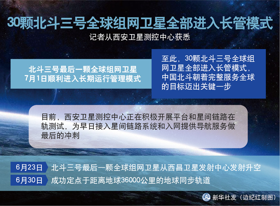 新華社西安7月1日電(李國利、徐新芳)記者從西安衛星測控中心獲悉,北斗三號最后一顆全球組網衛星1日順利進入長期運行管理模式,至此,30顆北斗三號全球組網衛星全部進入長管模式,中國北斗朝著完整服務全球的目標邁出關鍵一步。
