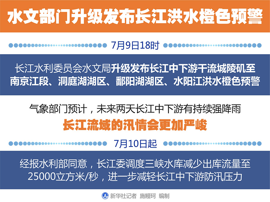 新華社武漢7月9日電(記者李思遠、樂文婉)長江水利委員會水文局9日18時升級發布長江中下游干流城陵磯至南京江段、洞庭湖湖區、鄱陽湖湖區、水陽江洪水橙色預警。水文部門提醒,有關單位和公眾務必注意防范日益嚴峻的汛情。