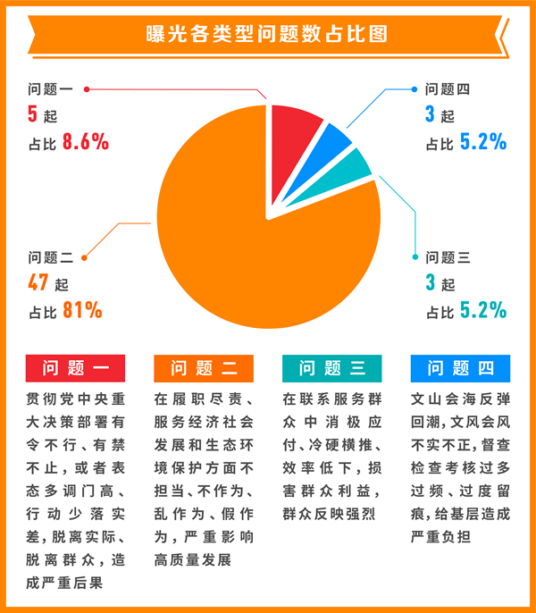 從具體問題類型看,“貫徹黨中央重大決策部署有令不行、有禁不止,或者表態多調門高、行動少落實差,脫離實際、脫離群眾,造成嚴重后果”方面問題5起,占比8.6%;“在履職盡責、服務經濟社會發展和生態環境保護方面不擔當、不作為、亂作為、假作為,嚴重影響高質量發展”方面問題47起,占比81%;“在聯系服務群眾中消極應付、冷硬橫推、效率低下,損害群眾利益,群眾反映強烈”方面問題3起,占比5.2%;“文山會海反彈回潮,文風會風不實不正,督查檢查考核過多過頻、過度留痕,給基層造成嚴重負擔”方面問題3起,占比5.2%。