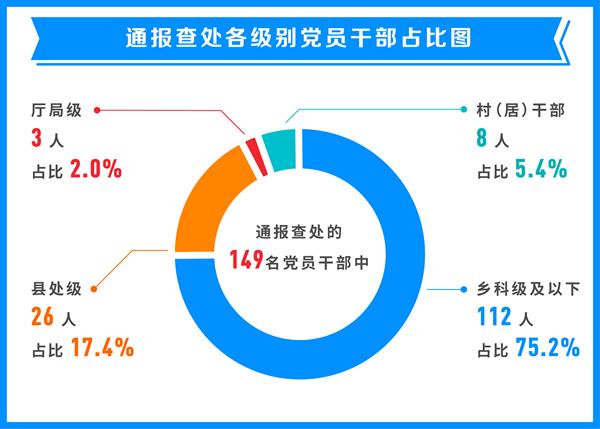 從處理各級別黨員干部人數看,通報的58起典型問題,查處的149名黨員干部中,村(居)干部8人,占全部人數5.4%;鄉科級及以下112人,占全部人數75.2%;縣處級26人,占全部人數17.4%;地廳級3人,占全部人數2.0%。通報數據印證,重點整治群眾身邊特別是群眾反映強烈的形式主義、官僚主義突出問題十分必要。