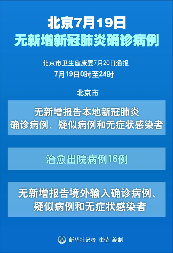 新華社北京7月20日電(記者俠克)北京市衛(wèi)生健康委20日通報,7月19日0時至24時,北京市無新增報告本地新冠肺炎確診病例、疑似病例和無癥狀感染者,治愈出院病例16例;無新增報告境外輸入確診病例、疑似病例和無癥狀感染者。