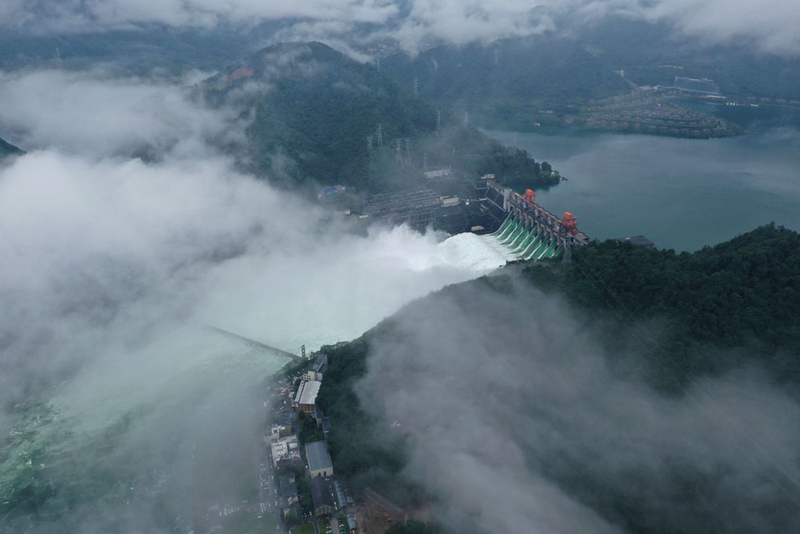 7月8日,新安江水庫開啟9孔泄洪(無人機照片)。新華社發(李忠 攝)