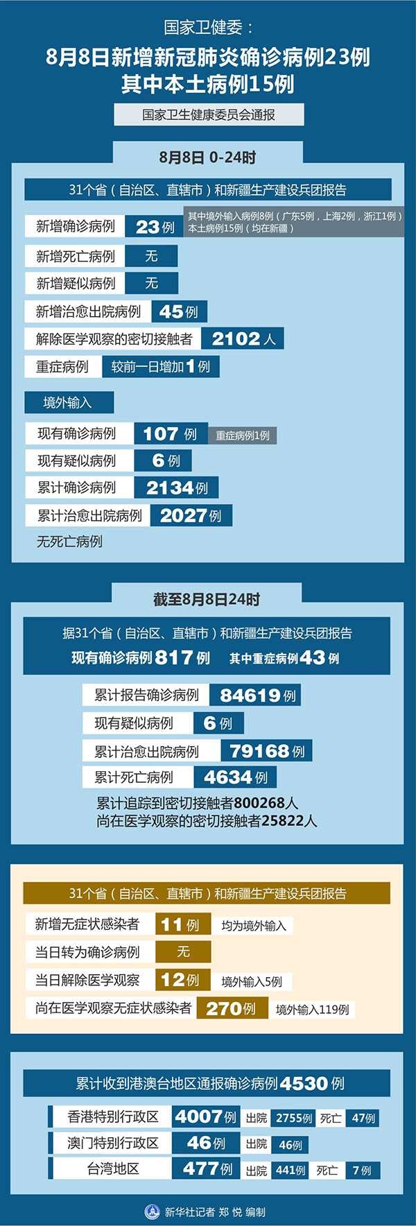 截至8月8日24時,據(jù)31個省(自治區(qū)、直轄市)和新疆生產(chǎn)建設(shè)兵團報告,現(xiàn)有確診病例817例(其中重癥病例43例),累計治愈出院病例79168例,累計死亡病例4634例,累計報告確診病例84619例,現(xiàn)有疑似病例6例。累計追蹤到密切接觸者800268人,尚在醫(yī)學(xué)觀察的密切接觸者25822人。