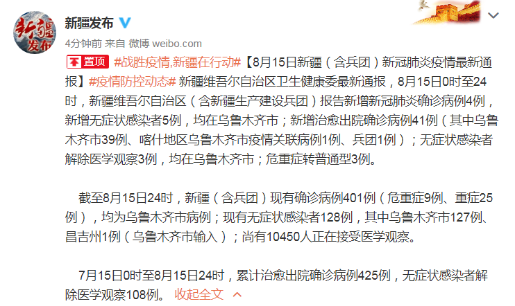 截至8月15日24時,新疆(含兵團)現有確診病例401例(危重癥9例、重癥25例),均為烏魯木齊市病例;現有無癥狀感染者128例,其中烏魯木齊市127例、昌吉州1例(烏魯木齊市輸入);尚有10450人正在接受醫學觀察。
