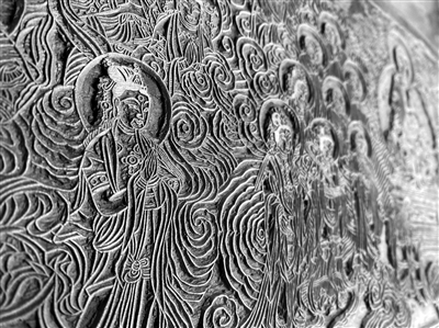 隨著白富鋼的五指輕盈地在古老的木板上游走,一塊木質經板上縱橫的紋理逐漸明晰起來。這批經板始刻于清雍正十一年(公元1733年),完成于清乾隆三年(公元1738年),是我國漢文大藏經卷帙中收錄最豐富,也是最后一部官方雕印本。經板共計79036塊,總重達400噸。堪稱我國木板經書之最。