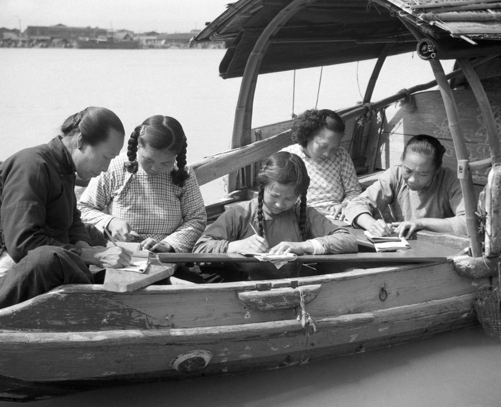↑ 1958年,福建省福州市生活在水上的婦女在船頭練習寫字。解放前,福州市的水上居民中婦女100%都是文盲。解放后,她們走進了識字班,在當地小學教師的輔導下開展掃盲學習。
