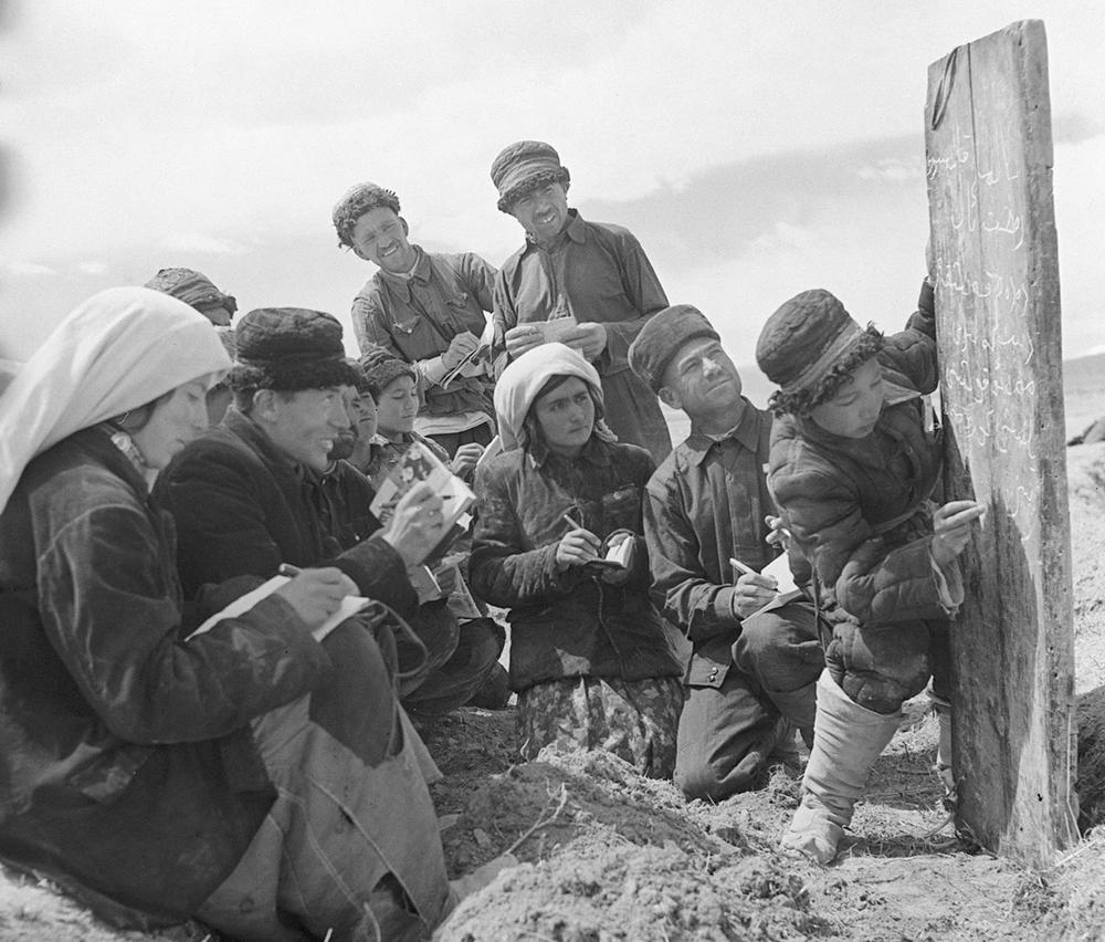 ↑ 1960年,新疆塔什庫爾干塔吉克族自治縣慕士塔格人民公社二大隊的社員在小學生的幫助下學習文化。