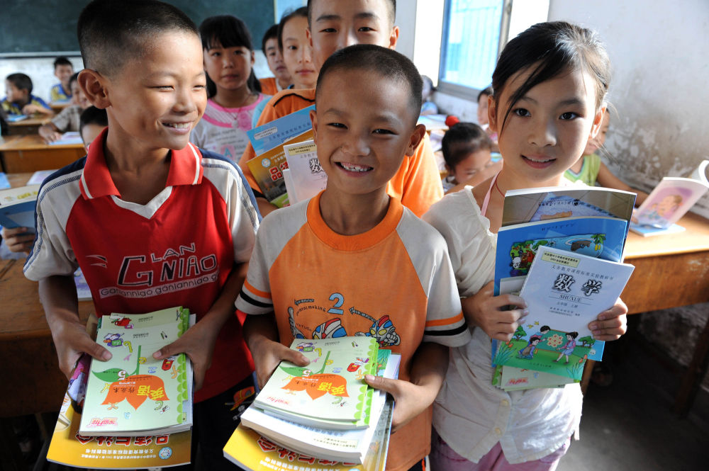 ↑ 這是2008年9月1日,江西樟樹市第二小學五(1)班鄧文俊(中)等同學領到免費教科書。