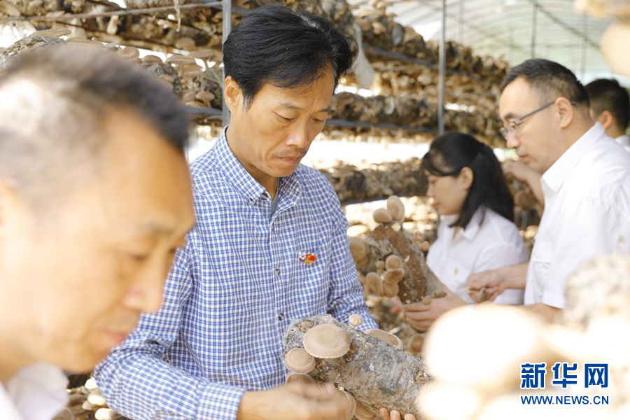 ??? 在第一書記郭旗(左二)的動員下,2019年9月,中國鐵路西安局集團有限公司西安供電段黨員、干部到唐灣村幫助村民采摘豐收的香菇。新華網(wǎng)發(fā)(西安供電段駐唐灣村扶貧工作隊供圖)