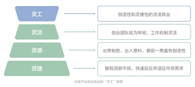 抖音就業人員規模龐大、類型多樣、形態各異。《報告》認為,其就業特色可以用“靈工”來概括,即具有靈活、靈氣和靈捷的特征,更強調多元化和創造力,不同于共享經濟平臺和傳統“零工”就業特征。