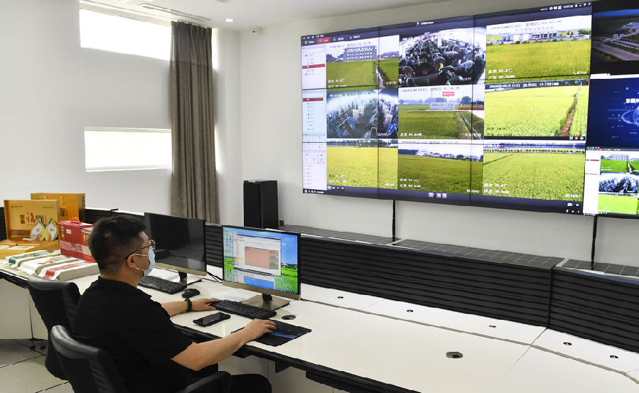 在吉林市昌邑區大荒地村,工作人員在東福米業現代農業信息化監視指控中心通過監控系統查看稻田情況(8月13日攝)。新華社記者 許暢 攝