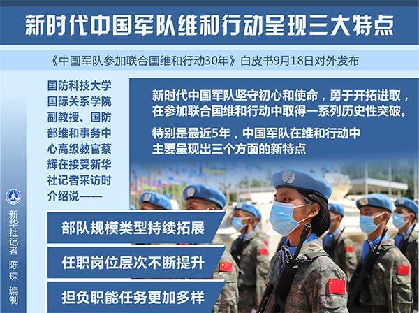 新華社北京9月18日電(記者黎云、張汨汨)《中國軍隊參加聯(lián)合國維和行動30年》白皮書18日對外發(fā)布。國防科技大學(xué)國際關(guān)系學(xué)院副教授、國防部維和事務(wù)中心高級教官蔡輝在接受新華社記者采訪時介紹說,新時代中國軍隊堅守初心和使命,勇于開拓進取,在參加聯(lián)合國維和行動中取得一系列歷史性突破。特別是最近5年,中國軍隊在維和行動中主要呈現(xiàn)出三個方面的新特點。