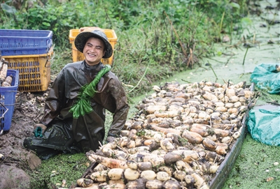 蓮藕是湖北省重要的特色農產品。吳祺經歷了蓮藕畝產從不足1000公斤到2000多公斤的跨越,也見證了從幾毛錢一公斤鮮藕到1元錢一小袋蓮藕制成品零食的增值。“這些影響賣相的‘邊角料’也有用,可以加工成藕粉?!彼闷饚坠澅魂舻呐侯^說。
