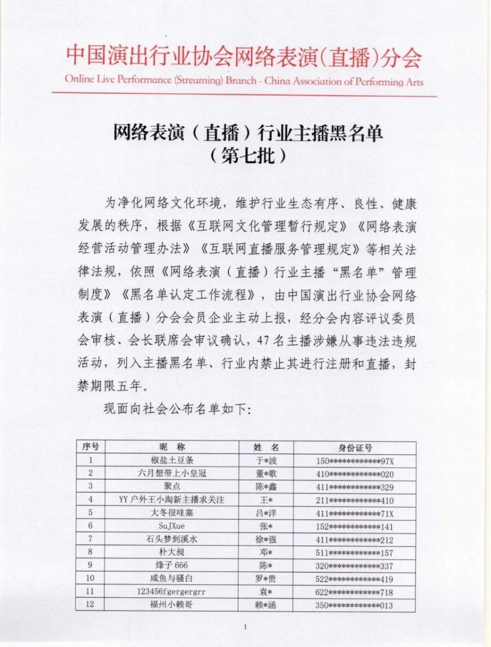 中國演出行業協會網絡表演(直播)分會透露,根據《互聯網文化管理暫行規定》《網絡表演經營活動管理辦法》《互聯網直播服務管理規定》等相關法律法規,按照《網絡表演(直播)行業主播“黑名單”管理制度》《黑名單認定工作流程》規定,向社會公布第七批主播黑名單,47名被列入黑名單的主播將在行業內禁止注冊和直播,封禁期限5年。(記者 韓軒)
