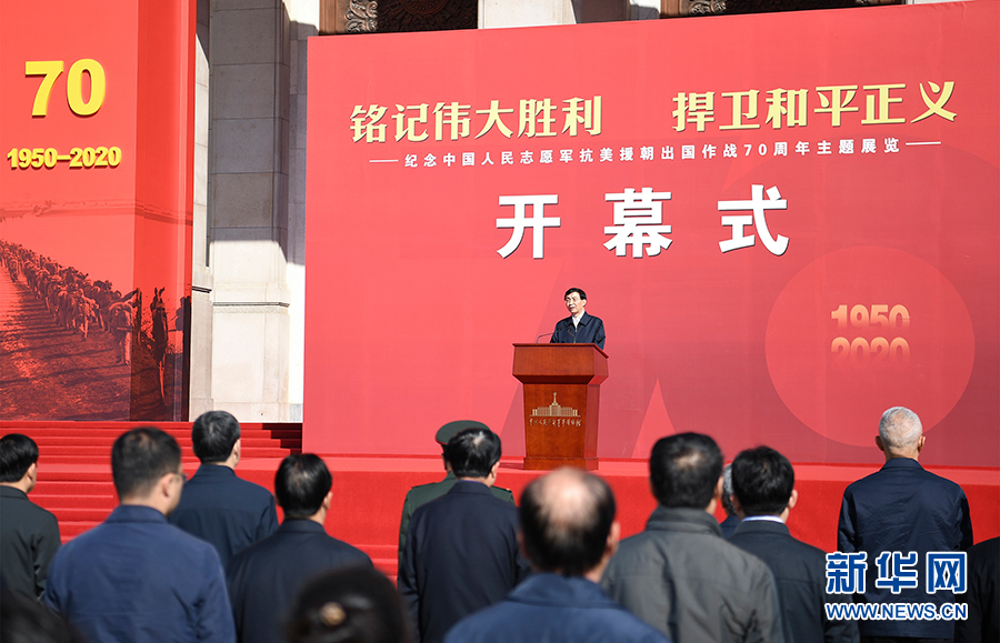 10月19日,“銘記偉大勝利 捍衛和平正義——紀念中國人民志愿軍抗美援朝出國作戰70周年主題展覽”開幕式在中國人民革命軍事博物館舉行。中共中央政治局常委、中央書記處書記王滬寧發表講話并宣布展覽開幕。 新華社記者 燕雁 攝