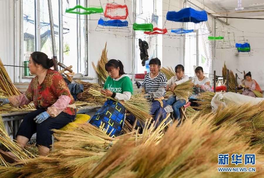 貧困戶在巴林左旗林東鎮扶貧車間內制作笤帚(2019年8月5日攝)。新華社記者 彭源 攝