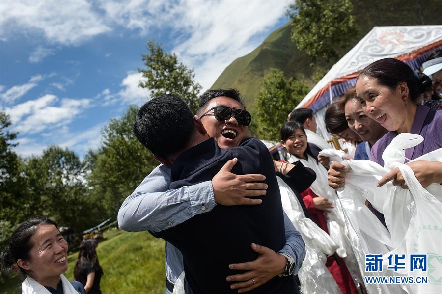 在西藏拉薩市達孜區,北京大學腫瘤醫院的援藏醫生袁燦(帶墨鏡者)與送別的藏族同事擁抱(8月1日攝)。新華社記者 彭子洋 攝