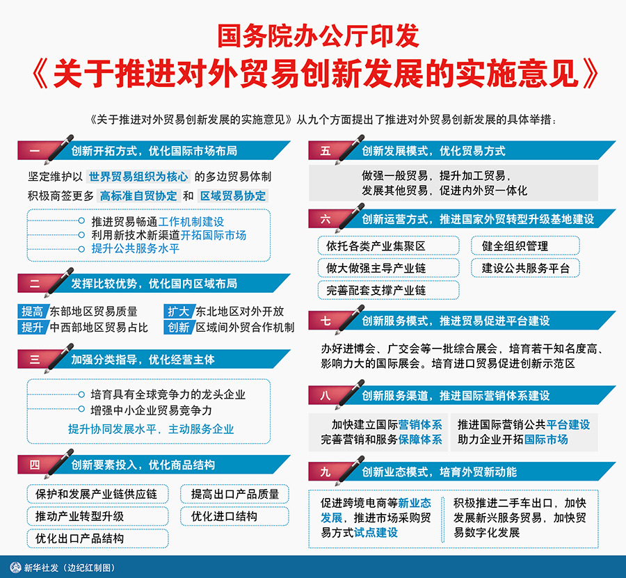 一是創(chuàng)新開拓方式,優(yōu)化國際市場布局。堅定維護以世界貿(mào)易組織為核心的多邊貿(mào)易體制,積極商簽更多高標(biāo)準(zhǔn)自貿(mào)協(xié)定和區(qū)域貿(mào)易協(xié)定。推進(jìn)貿(mào)易暢通工作機制建設(shè),利用新技術(shù)新渠道開拓國際市場,提升公共服務(wù)水平。二是發(fā)揮比較優(yōu)勢,優(yōu)化國內(nèi)區(qū)域布局。提高東部地區(qū)貿(mào)易質(zhì)量,提升中西部地區(qū)貿(mào)易占比,擴大東北地區(qū)對外開放,創(chuàng)新區(qū)域間外貿(mào)合作機制。三是加強分類指導(dǎo),優(yōu)化經(jīng)營主體。培育具有全球競爭力的龍頭企業(yè),增強中小企業(yè)貿(mào)易競爭力,提升協(xié)同發(fā)展水平,主動服務(wù)企業(yè)。四是創(chuàng)新要素投入,優(yōu)化商品結(jié)構(gòu)。保護和發(fā)展產(chǎn)業(yè)鏈供應(yīng)鏈,推動產(chǎn)業(yè)轉(zhuǎn)型升級,優(yōu)化出口產(chǎn)品結(jié)構(gòu),提高出口產(chǎn)品質(zhì)量,優(yōu)化進(jìn)口結(jié)構(gòu)。五是創(chuàng)新發(fā)展模式,優(yōu)化貿(mào)易方式。做強一般貿(mào)易,提升加工貿(mào)易,發(fā)展其他貿(mào)易,促進(jìn)內(nèi)外貿(mào)一體化。六是創(chuàng)新運營方式,推進(jìn)國家外貿(mào)轉(zhuǎn)型升級基地建設(shè)。依托各類產(chǎn)業(yè)集聚區(qū),做大做強主導(dǎo)產(chǎn)業(yè)鏈,完善配套支撐產(chǎn)業(yè)鏈,健全組織管理,建設(shè)公共服務(wù)平臺。七是創(chuàng)新服務(wù)模式,推進(jìn)貿(mào)易促進(jìn)平臺建設(shè)。辦好進(jìn)博會、廣交會等一批綜合展會,培育若干知名度高、影響力大的國際展會。培育進(jìn)口貿(mào)易促進(jìn)創(chuàng)新示范區(qū)。八是創(chuàng)新服務(wù)渠道,推進(jìn)國際營銷體系建設(shè)。加快建立國際營銷體系,完善營銷和服務(wù)保障體系。推進(jìn)國際營銷公共平臺建設(shè),助力企業(yè)開拓國際市場。九是創(chuàng)新業(yè)態(tài)模式,培育外貿(mào)新動能。促進(jìn)跨境電商等新業(yè)態(tài)發(fā)展,推進(jìn)市場采購貿(mào)易方式試點建設(shè)。積極推進(jìn)二手車出口,加快發(fā)展新興服務(wù)貿(mào)易,加快貿(mào)易數(shù)字化發(fā)展。
