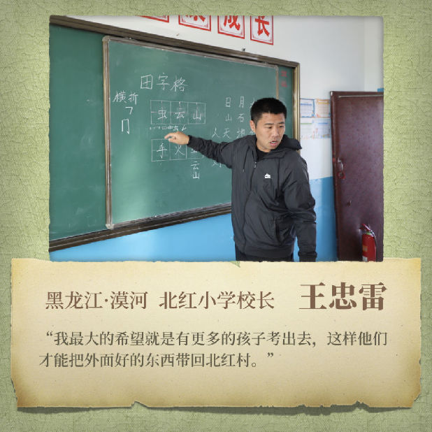 這所位于黑龍江省漠河市北極鎮(zhèn)北紅村的北紅小學(xué)只有兩位老師、3個(gè)年級(jí)和11名學(xué)生。“80后”校長王忠雷每天在數(shù)學(xué)、體育、思想品德三個(gè)科目中“周旋”。打開課件,他向?qū)W生熟練講授“體積與容積”相關(guān)知識(shí)的時(shí)候,隔壁教室傳來妻子于晶的語文課上孩子們瑯瑯的讀書聲……