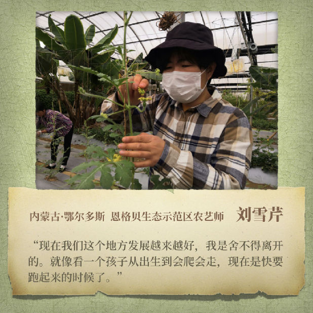 2009年初,大學(xué)畢業(yè)剛半年的劉雪芹來到恩格貝。彼時(shí),面對(duì)有技術(shù)門檻的設(shè)施農(nóng)業(yè),當(dāng)?shù)貛缀鯖]有熟練工人,種植、育苗都需要?jiǎng)⒀┣凼职咽纸獭2輼I(yè)科學(xué)專業(yè)畢業(yè)的劉雪芹克服著環(huán)境、氣候等困難,同時(shí)也懂得借助自然的力量。
