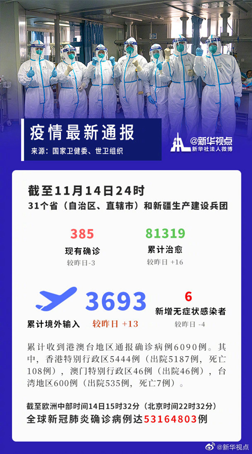 截至11月14日24時,據31個省(自治區、直轄市)和新疆生產建設兵團報告,現有確診病例385例(其中重癥病例4例),累計治愈出院病例81319例,累計死亡病例4634例,累計報告確診病例86338例,現有疑似病例2例。累計追蹤到密切接觸者873191人,尚在醫學觀察的密切接觸者15032人。