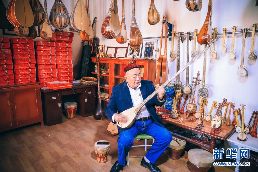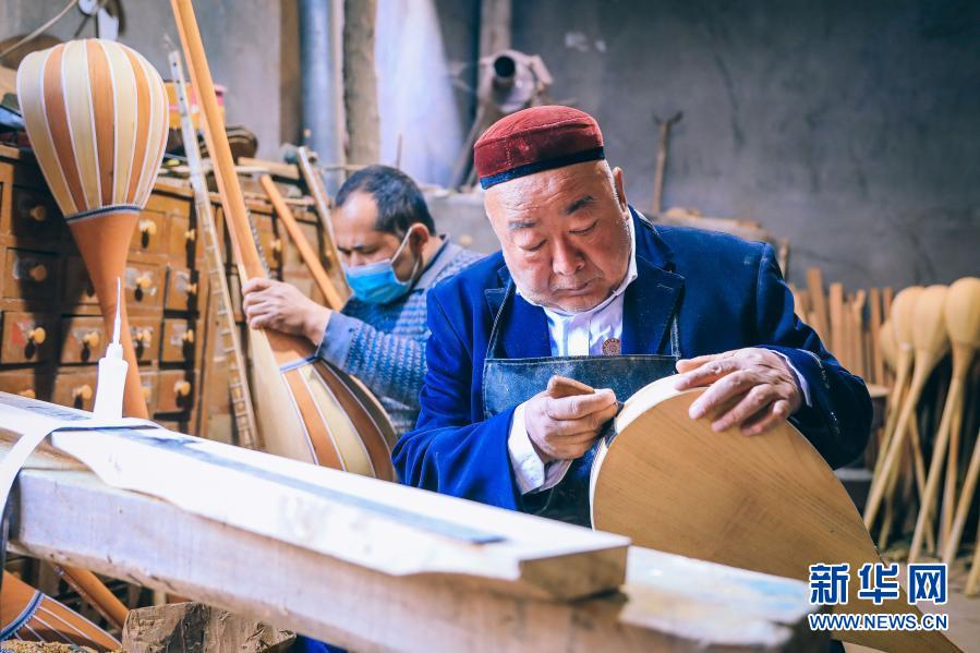在村里,艾依提·依明與其他幾位“非遺”傳承人,不僅是技藝傳播者,也是致富帶頭人。因為艾依提·依明制作的樂器音節準、音色美、造型漂亮,深受市場歡迎,附近很多村民慕名前來拜師學藝。他回憶,幾十年來,他已帶出200多名徒弟,這些來自貧困家庭的農村年輕人通過幾年學習,基本都可以靠樂器制作、維修、演奏實現增收。