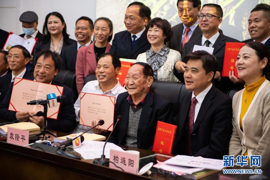 11月13日,在湖南雜交水稻研究中心舉行的“袁隆平農業科技獎”頒獎儀式上,袁隆平(前排右三)和獲獎人員合影。新華社記者 陳思汗 攝
