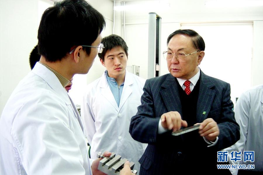 中國工程院院士、哈爾濱工業大學教授杜善義(右)為學生講解復合材料(資料照片)。新華社發