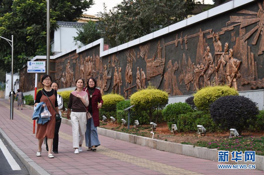 11月17日,行人在福建省三明市三鋼集團(tuán)生活區(qū)走過浮雕墻。新華社記者 姜克紅 攝