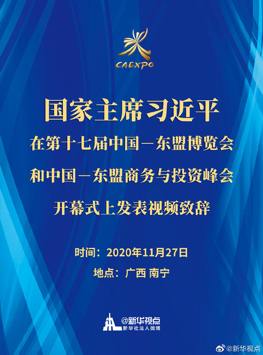 第十七屆中國-東盟博覽會和中國-東盟商務與投資峰會開幕式11月27日在廣西南寧舉行。國家主席習近平發表視頻致辭。?