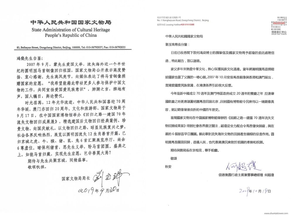 2019年11月,為慶祝中華人民共和國成立70周年和澳門回歸20周年,在國家文物局積極溝通協調下,何鴻燊先生決定將圓明園馬首銅像正式捐贈國家文物局。