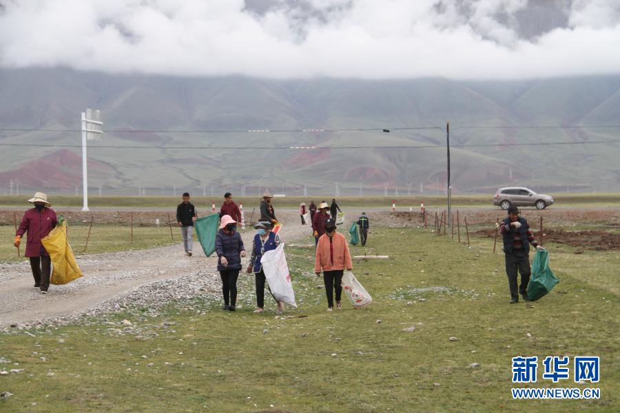 三江源國家公園治多生態環保協會的志愿者在撿拾垃圾(6月15日攝)。新華社發
