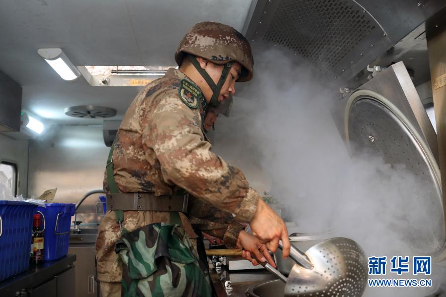 飲食保障隊參賽隊員在野戰(zhàn)炊事車內加工制作野戰(zhàn)快餐(11月29日攝)。新華社發(fā)(呂冀周 攝)
