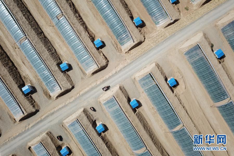 在古浪縣黃花灘生態移民區富民新村,村民李應川駕駛三輪車行駛在日光溫室大棚間的道路上(4月9日攝,無人機照片)。新華社記者 范培珅 攝