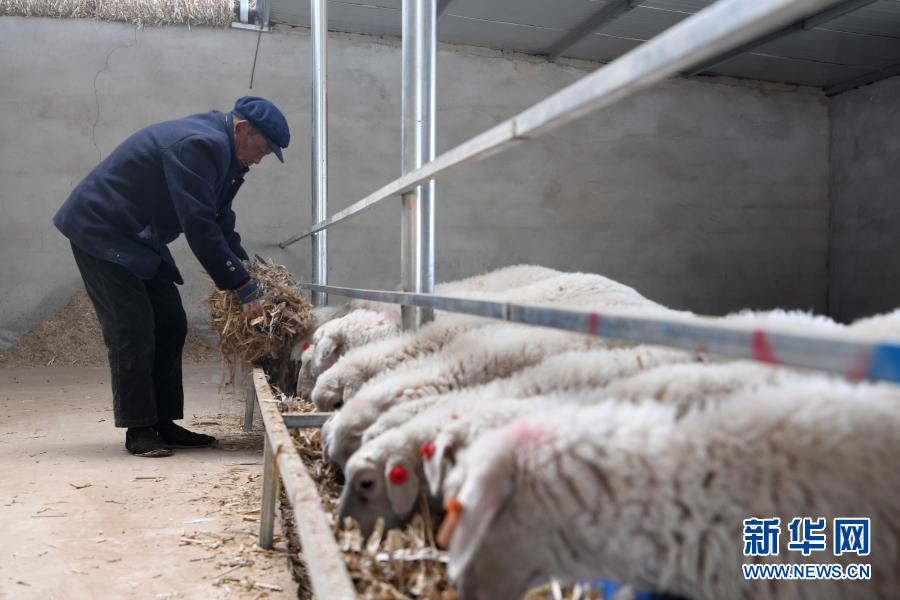 在古浪縣黃花灘生態移民區富民新村養殖小區,村民李應川在喂羊(3月10日攝)。新華社記者 范培珅 攝