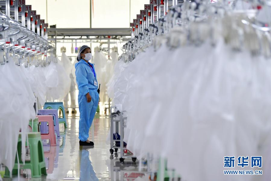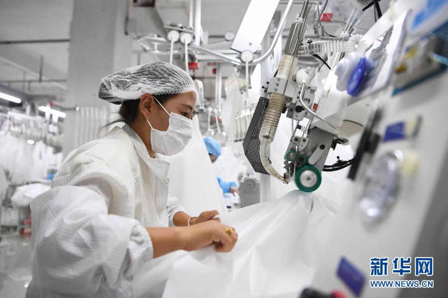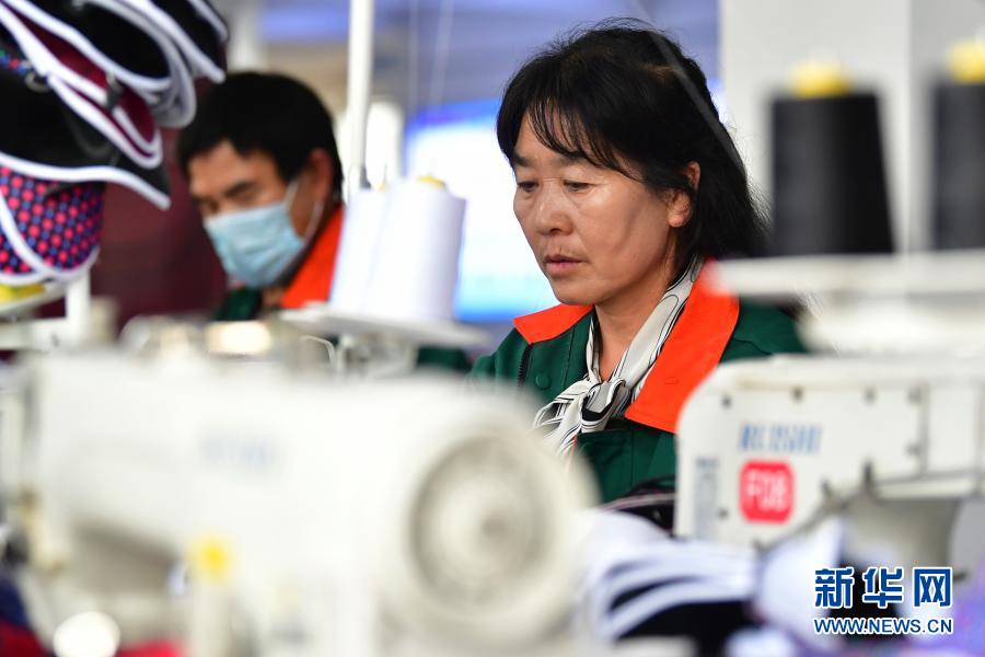 在臨夏回族自治州積石山縣,依托東西部扶貧協作平臺引進的服裝加工企業甘肅拓奇扶貧車間的員工在服裝加工生產線上作業(8月9日攝)。新華社記者 陳斌 攝