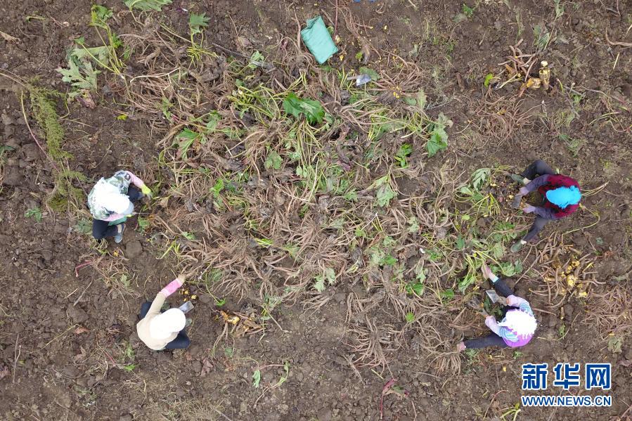 在宕昌縣拉路梁中藥材標準化種植示范基地,村民收獲藥材(9月18日攝,無人機照片)。新華社記者 范培珅 攝
